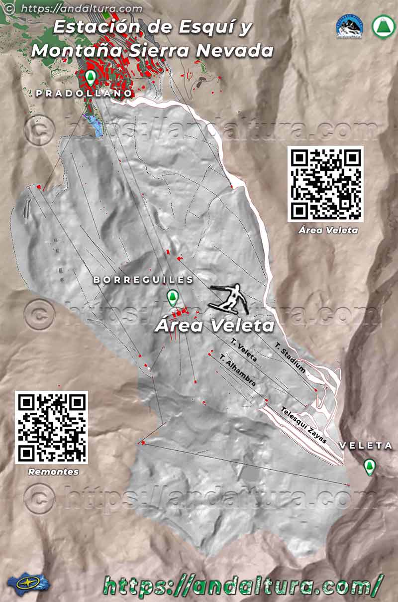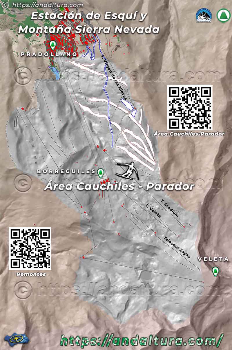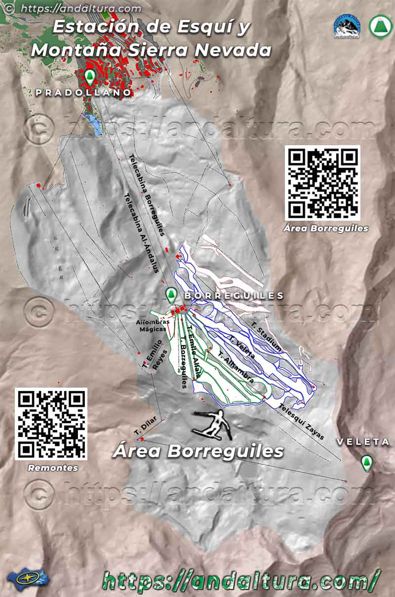 El Área Esquiable de la Estación de Esquí Sierra Nevada comprende todas las zonas a las que se puede acceder mediante los Remontes habilitados, y que cada día se encuentran en funcionamiento.
