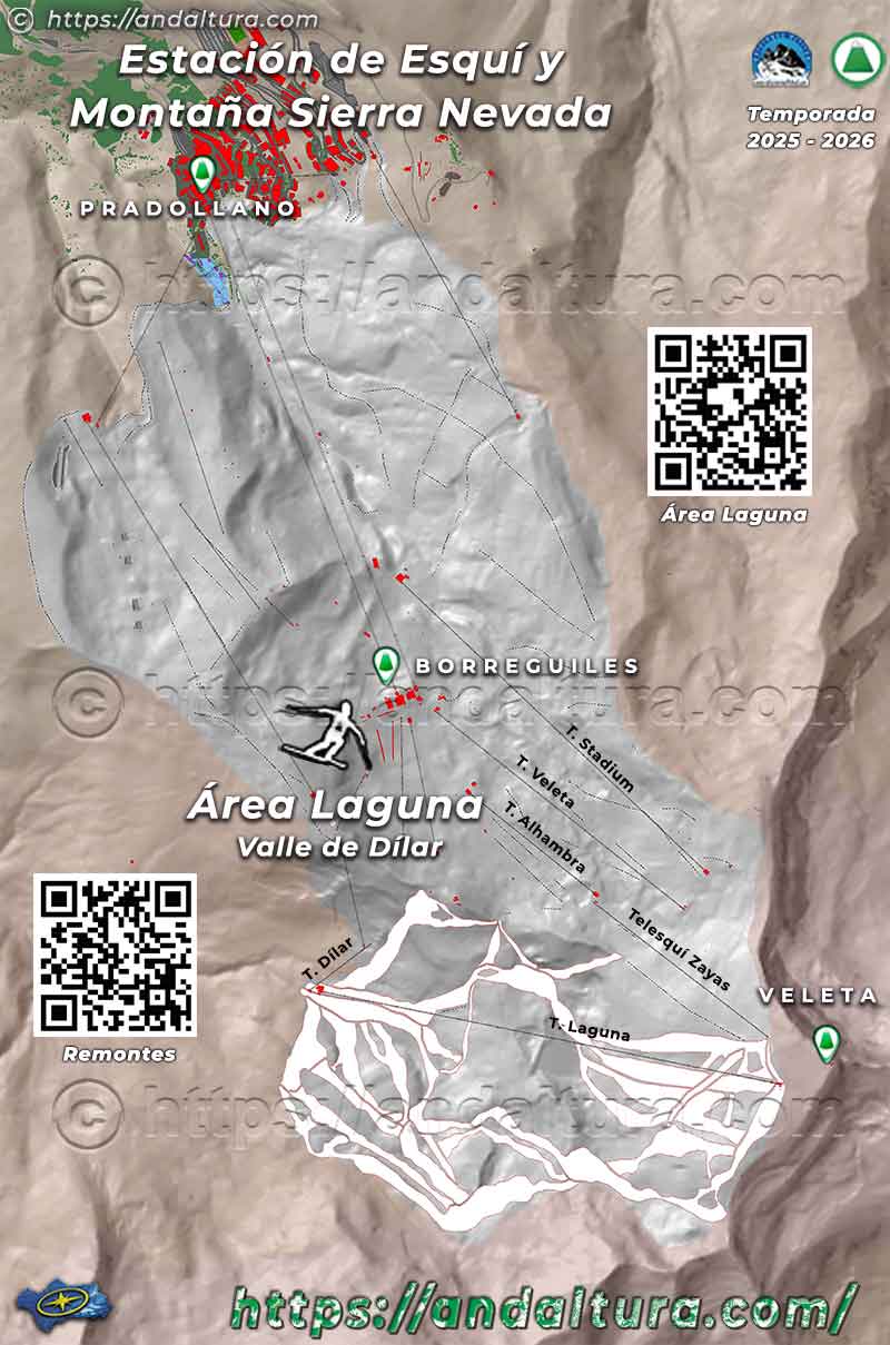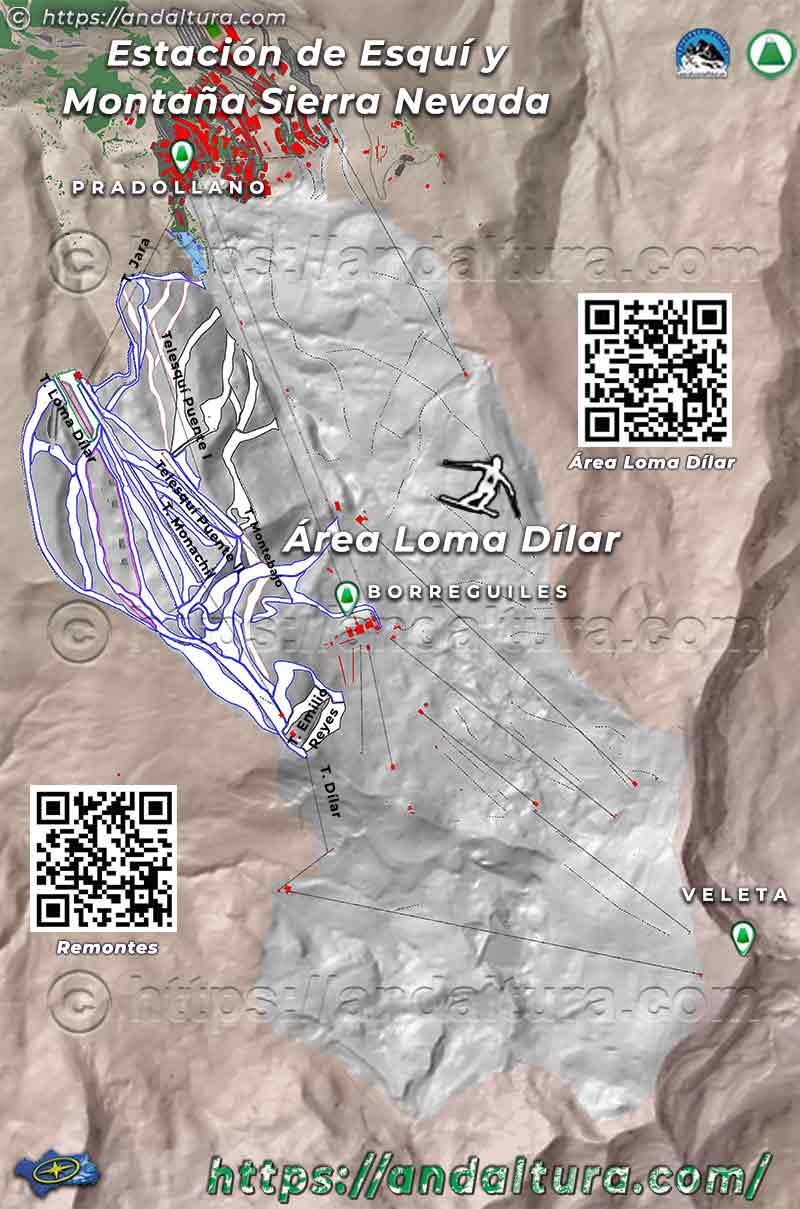 Inicia a 2.846 metros de altitud y combina pistas como Loma Dílar, Peñón del Dílar y el Boulevard, ofreciendo pendientes suaves y zonas para freestyle en el parque Sulayr.